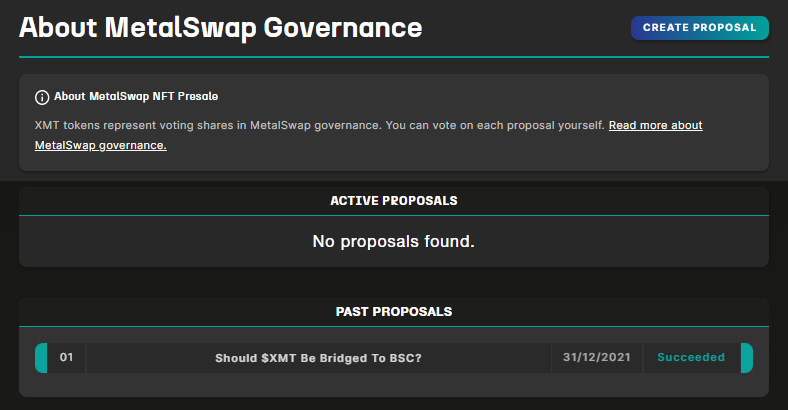 Through the "Create Proposal" button anyone has the opportunity to make a proposal for modification/improvement of the MetalSwap project.