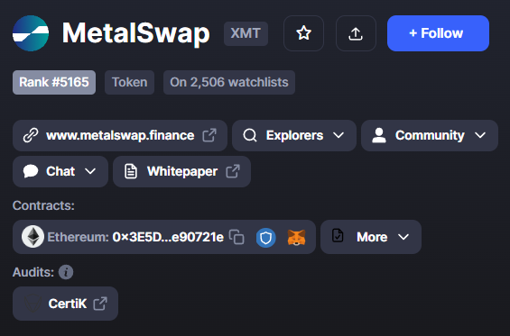 Search on Coinmarketcap for Metalswap's smart contract (XMT).
