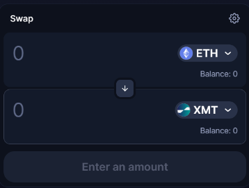 Insert now the amount of ETH, or other token chosen, for the equivalent in XMT. Always remember to have some fraction of ETH to pay the swap fees.