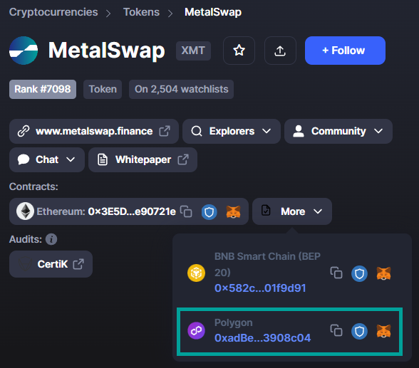 Search on Coinmarketcap for Metalswap's smart contract (XMT). As MetalSwap is native on the Ethereum network, search for its equivalent token on the Polygon network.
