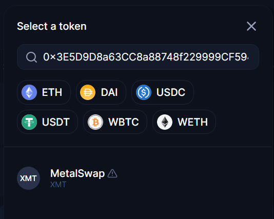Enter (paste) the $XMT contract in the box and select the MetalSwap token