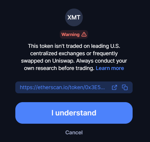 Read the warnings and continue by clicking on "I understand" and import the token selected.