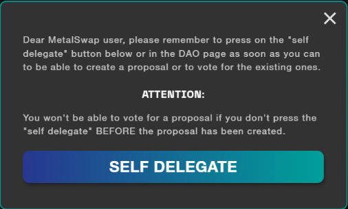 - On the FIRST access to this section, the user must give the consent to the "Self Delegate" for the smart contract to verify the number of tokens into the wallet and thus calculate the consequent voting power.