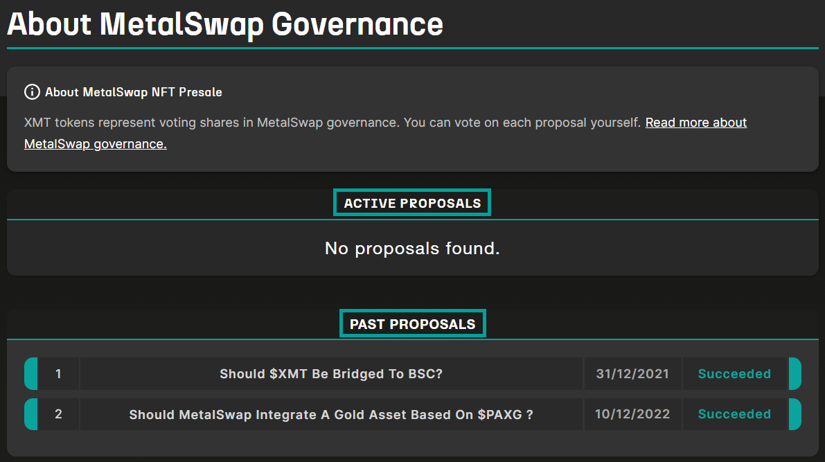 In order to be eligible to vote, the user must have $XMT in the wallet or on Official MetalSwap ’s Ethereum Mainchain Active Pools BEFORE the proposal goes live.