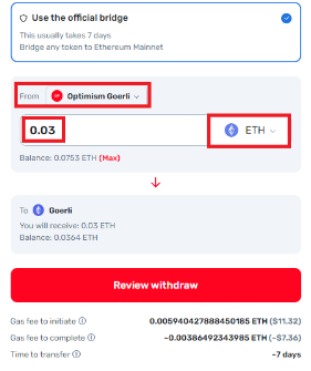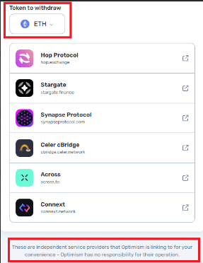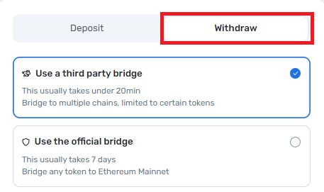 After selecting the Withdraw tag, you can choose to use the same OP official Bridge use for the deposit or to use a third party bridge.