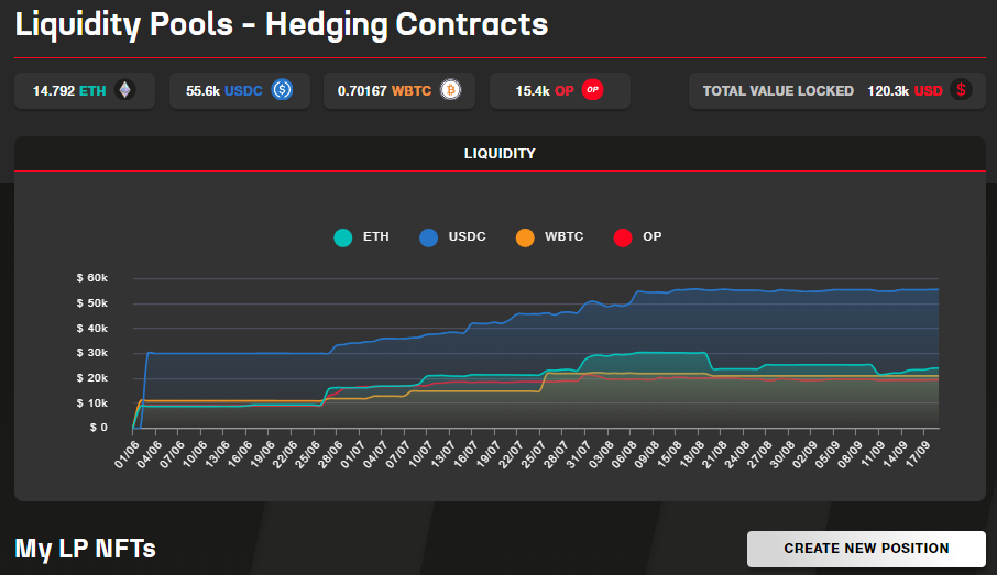 With the "Create New Position" button, is possible provided liquidity ( ETH, WBTC, USDT and OP )