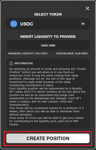 Enter the amount of liquidity you wish to provide and click on "Create Position."