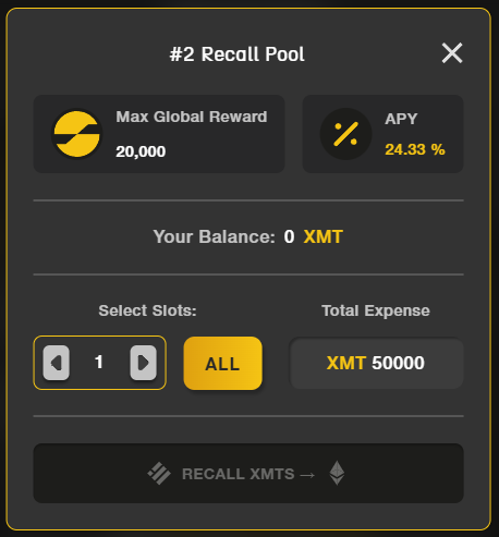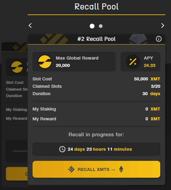 After reaching the Recall Pool, is now necessary deposit the required amount into one of the 20 available slots. As you can see from the screen above, in this example only one Slot is left to be claimed from a user that wants to deposit in this Recall Pool exactly 50k XMT tokens.