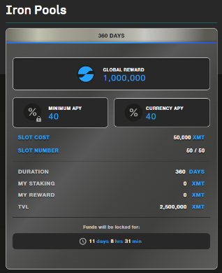 To make this performance possible, this pools have a limited number of entries (number of SLOTS). These entries are allowed with the payment of a fixed amount of $XMT (SLOT Cost).