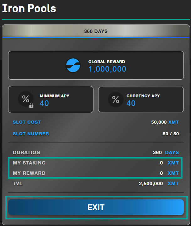 By clicking on the EXIT button, it will be possible to redeem the $XMT with the respective accrued rewards.