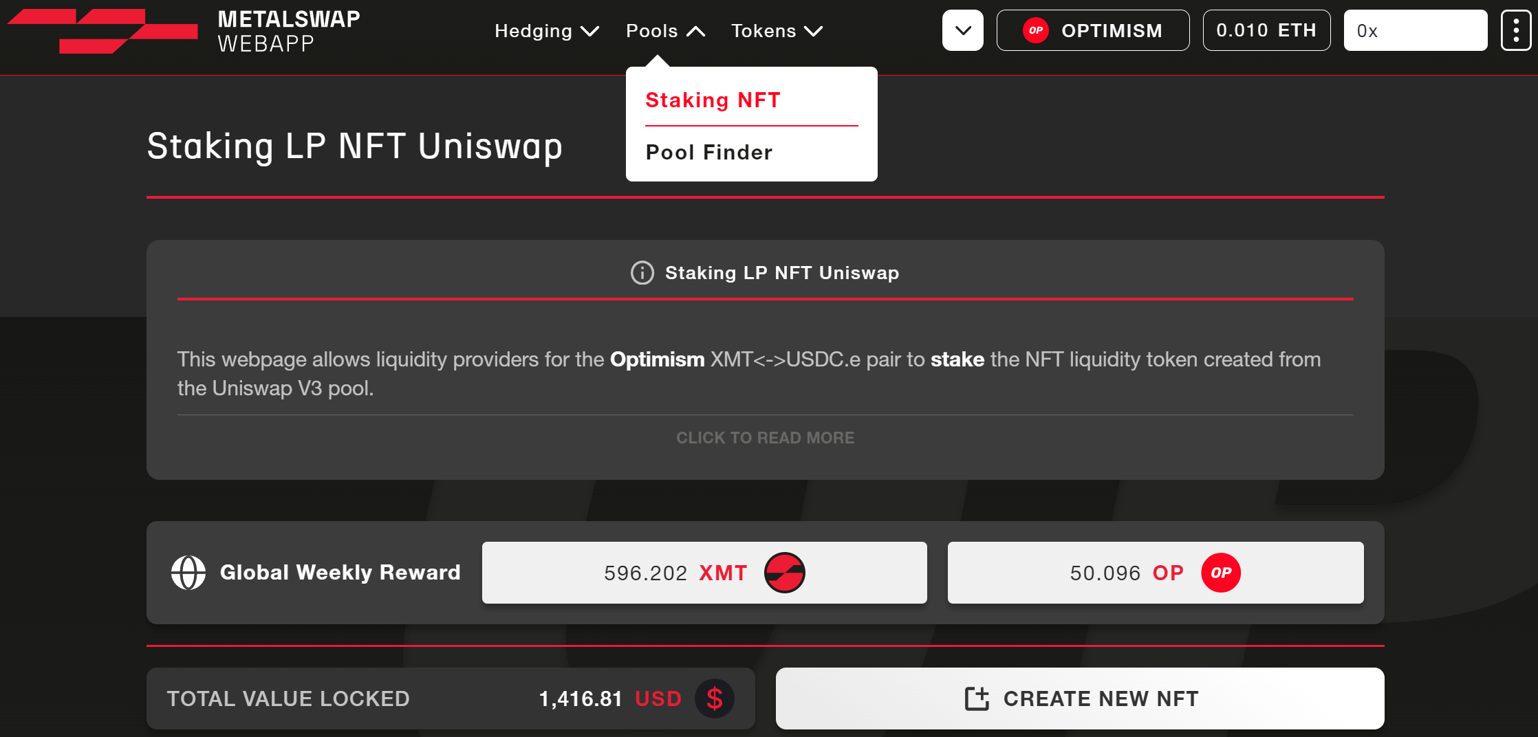 This webpage allows liquidity providers for the Optimism XMT↔USDC.e pair to stake the NFT Liquidity Providing token created from the Uniswap V3 pool. By staking his liquidity NFT, the user cedes his/her rights to the Uniswap fees generated by their NFTs but gets an increased reward in XMT and OP tokens.