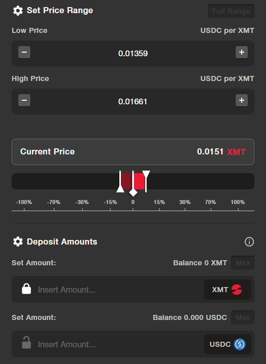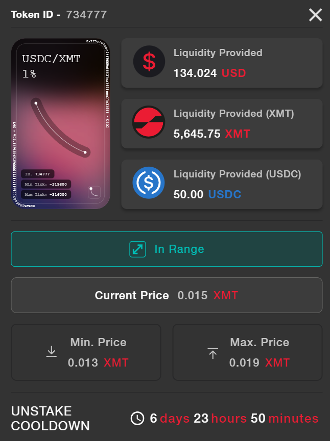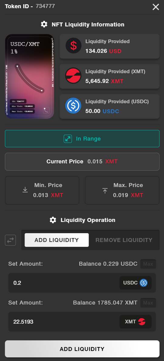 Here the user can set and review the amounts of $XMT and $USDC.e that will be deducted from your wallet in order to create/modify the Uniswap Liquidity NFT.