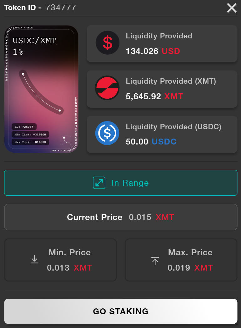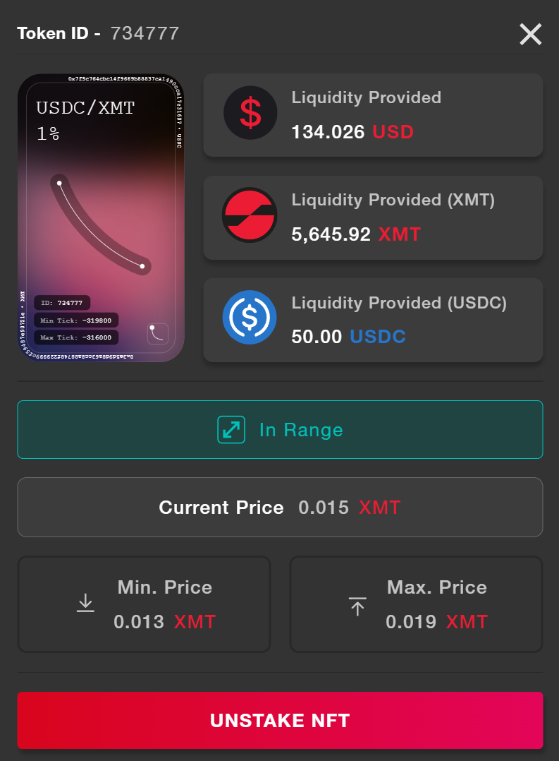 The Inspect button shows the NFT countervalue, how many XMT and USDC.e represents and if it is in range or not. From there users can Stake or Unstake their NFTs.