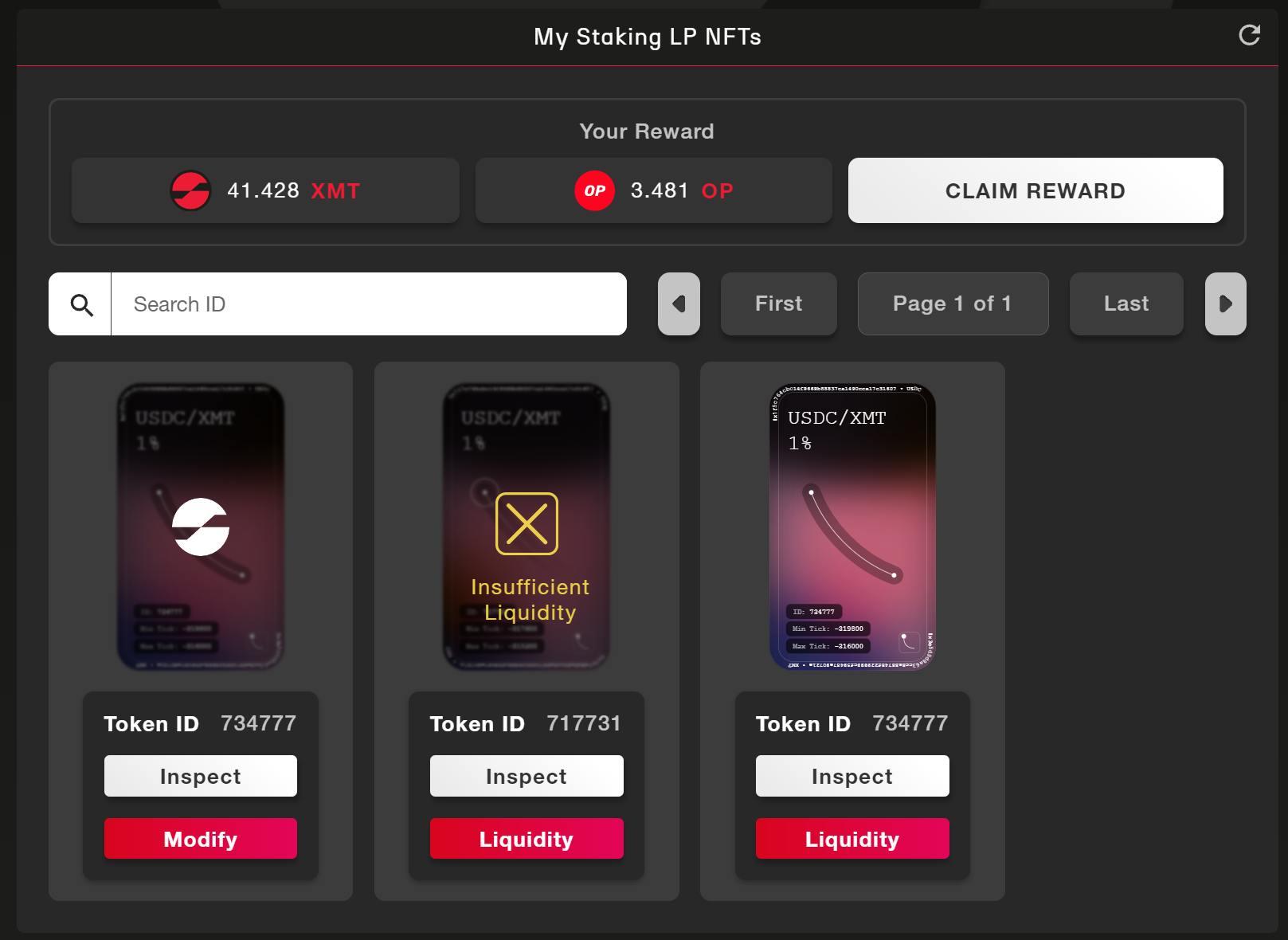 - Only NFT tokens representing liquidity of Optimistic V3 1% XMT↔USDC.e fee tier pool are eligible to be staked